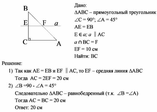 В прямоугольном треугольнике ABC ∠A = 45° (∠C = 90°); Е — середина АВ. Через точку Е проведена прямая, параллельная АС, которая пересекает ВС в точке F; EF = 10 см. Найдите ВС