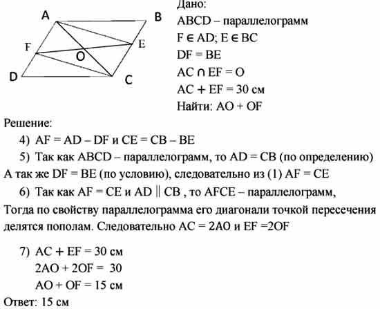 В параллелограмме ABCD на сторонах AD и ВС от вершин В и D отложены равные отрезки BE и DF. В четырехугольнике AECF диагонали пересекаются в точке О; AC + EF = 30 см. Найдите АО + OF