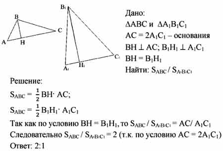 Высоты треугольников равны, а основание одного из них в два раза меньше другого. Найдите отношение площадей этих треугольников