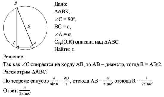 В прямоугольном треугольнике ABC (∠C = 90°) ∠A = а, ВС = а. Найдите радиус описанной вокруг треугольника окружности