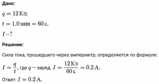 Определите показания амперметра, если за время t = 1,0 мин через сечение спирали лампы проходит заряд q = 12 Кл.