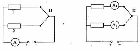 В цепи использован усложненный ключ-переключатель П. Объясните работу такой цепи. Дополните схему амперметрами, позволяющими измерить силу тока в каждом резисторе.