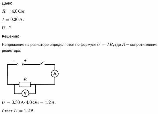 Выполняя практическую работу, ученик измерил силу тока в резисторе сопротивлением R = 4,0 Ом и напряжение на этом резисторе. Определите показания вольтметра, если амперметр показал I = 0,30 А. Нарисуйте схему такой цепи.