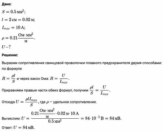 Свинцовая проволочка плавкого предохранителя имеет сечение S = 0,50 мм2 и длину l = 2,0 см. При каком напряжении сила тока в проволочке приняла бы предельно допустимое значение Iпред = 10 А?