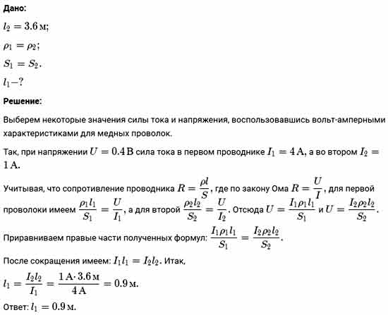 Для проведения эксперимента использовали две медные проволоки равного поперечного сечения. По результатам исследований построили вольт-амперные характеристики этих проволок. Определите длину первой проволоки, если длина второй проволоки l2 = 3,6 м.