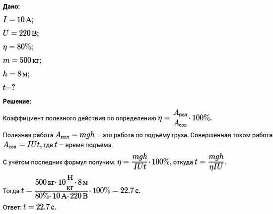 Электроподъемник потребляет ток силой I = 10 А при напряжении U = 220 В. Принимая КПД подъемника η = 80 %, рассчитайте время подъема груза массой m = 500 кг на высоту h = 8,0 м.