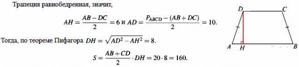 Основание равнобедренной трапеции равны 14 и 26, а её периметр равен 60. Найдите площадь трапеции.