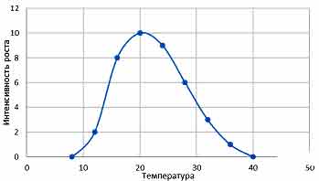 После какой температуры организм больше не растёт? На рисунке изображен график зависимости интенсивности роста от температуры.