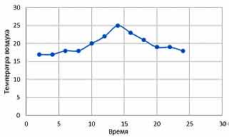 На рисунке изображён график зависимости температуры воздуха (отложено по оси y, в °С) от времени (отложено по оси х, в часах).