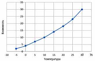На рисунке изображён график зависимости влажности воздуха (отложено по оси у) от температуры (отложено по оси х).