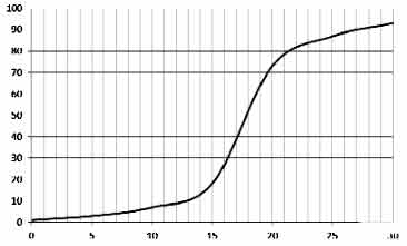 Известно, что момент распускания почек на деревьях зависит от двух факторов: длины светового дня и средней суточной температуры. На графике представлено количество деревьев, на которых распустилось большинство (больше 50%) почек, по числам апреля. По оси X отложены дни (числа апреля), по оси Y — процент деревьев с распустившимися почками.