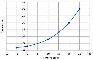 На рисунке изображен график зависимости влажности воздуха от температуры. Какова влажность воздуха при температуре окружающей среды 5 градусов?