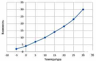На рисунке изображён график зависимости влажности воздуха (отложено по оси у) от температуры (отложено по оси х).