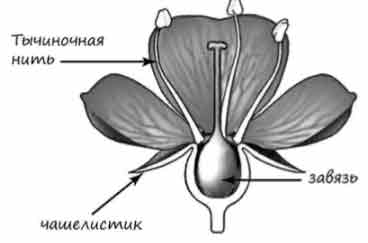 Покажите стрелками и подпишите на рисунке чашелистик, тычиночную нить, завязь.