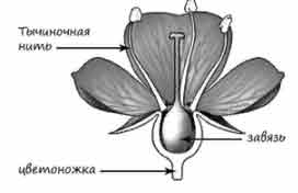 Покажите стрелками и подпишите на рисунке тычиночную нить, цветоножку, завязь