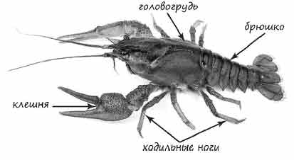Покажите стрелками и подпишите на рисунке клешню, головогрудь, ходильные ноги, брюшко рака.