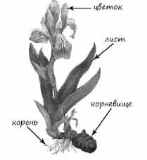 Покажите стрелками и подпишите на рисунке цветок, лист, корень и корневище ириса.
