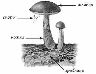 Покажите стрелками и подпишите на рисунке ножку, шляпку, грибницу и споры гриба