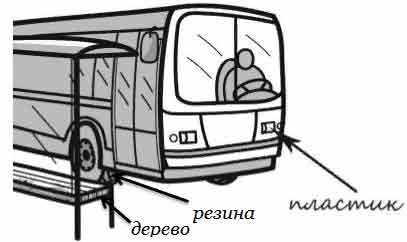 Внимательно рассмотри рисунок, на котором изображён автобус на остановке. Крышка фары автобуса может быть изготовлена из пластика. Она отмечена на рисунке стрелкой с соответствующей надписью. Какие предметы или детали среди изображённых на рисунке могут быть сделаны из дерева, а какие — из резины? Укажи на рисунке стрелкой любой предмет (деталь) из дерева и любой предмет (деталь) из резины. Подпиши название соответствующего материала рядом с каждой стрелкой.