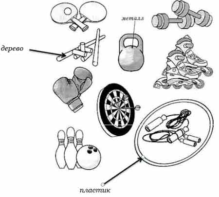 Внимательно рассмотри рисунки предметов. Это изображения спортивного инвентаря. Стрелкой с надписью «металл» отмечена гиря, которая может быть сделана из этого материала. По образцу отметь любой предмет (или его часть), который может быть сделан из пластика, и любой предмет (или его часть), который может быть сделан из дерева.