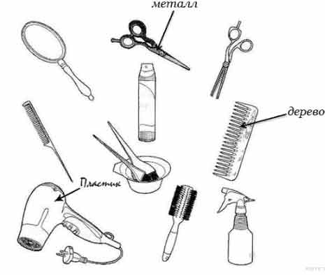Внимательно рассмотри рисунки предметов. Это изображения инструментов и принадлежностей парикмахера. Стрелкой с надписью «пластик» отмечен фен, который может быть сделан из этого материала. По образцу отметь любой предмет (или его часть), который может быть сделан из метала и любой предмет, который может быть сделан из дерева