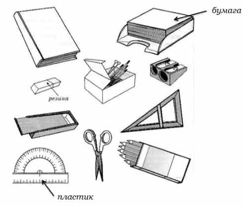 Внимательно рассмотри рисунки предметов. Это изображения канцелярских принадлежностей. Стрелкой с надписью «резина» отмечен ластик, который может быть сделан из этого материала. По образцу отметь любой предмет, который может быть сделан из бумаги, и любой предмет, который может быть сделан из пластика.