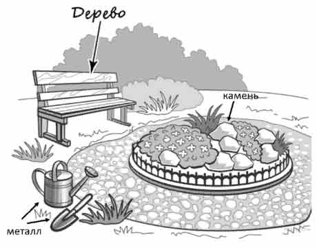 Рассмотри рисунок, на котором изображена клумба. Скамейка рядом с клумбой может быть изготовлена из дерева. Она отмечена на рисунке стрелкой с соответствующей надписью. Покажи на рисунке стрелкой любой предмет (любую деталь) из металла и любой предмет (любую деталь) из камня. Подпиши название соответствующего материала рядом с каждой стрелкой.