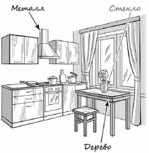 Рассмотри рисунок, на котором изображена кухня. Ваза изготовлена из стекла. Она отмечена на рисунке стрелкой с соответствующей надписью. Покажи на рисунке стрелкой любой предмет (любую деталь) из металла и любой предмет (любую деталь) из дерева. Подпиши название соответствующего материала рядом с каждой стрелкой.