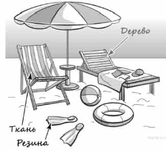 Рассмотри рисунок, на котором изображены предметы для отдыха на пляже. Лежак изготовлен из дерева. Он отмечен на рисунке стрелкой с соответствующей надписью.