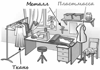 Рассмотри рисунок, на котором изображена швейная мастерская. Манекен изготовлен из пластмассы. Он отмечен на рисунке стрелкой с соответствующей надписью.