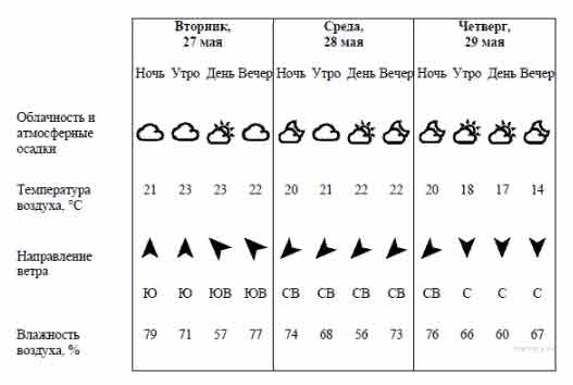 — находим строку «Облачность и атмосферные осадки» — переходим в первую колонку «вторник» — видим символы «облако» на протяжении всего дня, следовательно погода будет облачная и без осадков.