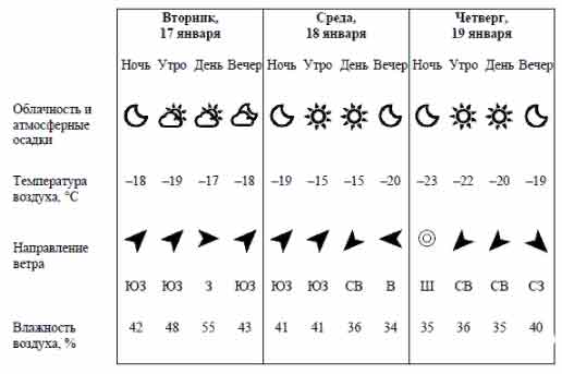 — находим строку «Направление ветра» — переходим во первую колонку «ВТОРНИК» — ночью, утром и вечером направление ветра ЮЗ (юго-западное).