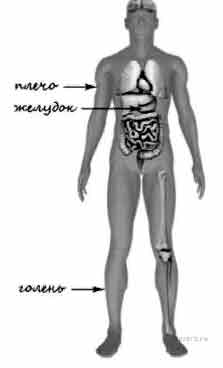 Рассмотри изображение человека. Покажи стрелками и подпиши голень, плечо и желудок человека так, как показано на примере