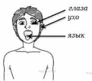 Внимательно рассмотри изображение человека. На левом рисунке стрелкой отмечен орган обоняния — нос. На правом рисунке покажи по образцу орган слуха, орган зрения и орган вкуса
