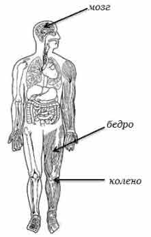 Внимательно рассмотри изображение человека. На левом рисунке стрелкой отмечена стопа. На правом рисунке покажи по образцу колено, бедро и головной мозг.