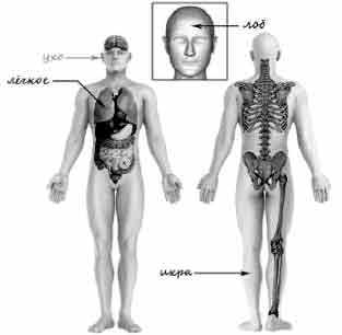 Рассмотри изображение человека. Покажи стрелками и подпиши лоб, икру и лёгкое человека так, как показано на примере