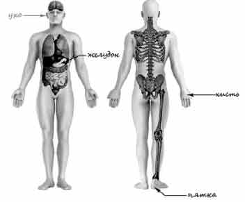 Рассмотри изображение человека. Покажи стрелками и подпиши пятку, кисть и желудок человека так, как показано на примере.