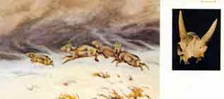 Предполагали, что сайгак — очень древнее животное. И по сей день его называют живым ископаемым. Древний сайгак, существовавший примерно 250 тысяч лет назад, мало чем отличался от современного. Остатки зверя были найдены в Западной Европе, в ископаемом асфальтовом озере под Баку и на Аляске. Но до сих пор не ясно, когда, от кого произошло это животное? Сайгак — стройная, легкая антилопа небольшого роста (около 75 см в холке), исключительно приспособленная для жизни на открытых пространствах. У нее мясистый широкий нос со сложной системой фильтров, предохраняющих дыхательные пути от попадания пыли (бежит сайгак, низко опустив голову к земле). Совершенно непонятно, в каких степях могло возникнуть столь удивительное приспособление? Другие особенности животного говорят о привычке жить в очень суровых климатических условиях, при недостатке пищи. Сайгак — настоящая северная антилопа.
