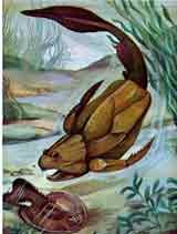 Панцирными рыбами обычно называют древнейших рыбообразных животных, из которых лишь часть была настоящими рыбами, то есть имела челюсти. Многие из панцирных, как изображенный ниже на открытке дрепанаспис, челюстей не имели (их не имеют современные его родственницы — миноги). Медленно передвигавшееся вдоль дна и втягивающее в ротовую воронку ил животное, внешне несколько походило на «летающее блюдце», но с подвижным, покрытым чешуей хвостом сзади. Сходство с фантастическими летательными аппаратами иногда объясняют тем, что при движении панцирных должна была возникать подъемная гидродинамическая сила, как у судов на подводных крыльях. По другим мнениям, панцирь являлся защитным приспособлением. Вверху рисунка показана настоящая панцирная рыба ботриолепис. Закованная в костяные доспехи, она напоминает средневекового рыцаря: голова, прикрытая шлемом, подвижно сочленена со сплошной кирасой из сросшихся щитков, закрывающей большую часть туловища. Жили эти животные в конце девонского периода, 360 миллионов лет назад.
