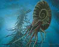 Наиболее характерными обитателями мезозойских морей были аммониты и белемниты. Аммониты жили в раковине, обычно свернутой тугой спиралью. Аммонитами их назвали за сходство их раковины с рогами барана — древнеегипетского бога Аммона изображали с бараньими рогами. Внутри раковина была разделена на отдельные камеры, в последней, самой большой, находилось само животное. В остальных камерах был газ, обеспечивающий плавучесть аммонита. Изменяя объем газа, аммонит мог менять свой вес и соответственно опускаться или подниматься в воде. Раковины аммонитов были маленькие, размером с металлический рубль, и огромные, как колеса, диаметром до двух метров. Аммонит был похож на сидящего в раковине осьминога, он имел десять рук с присосками и был хищником, нападавшим на других донных животных. За мезозой на Земле сменилось несколько десятков тысяч видов аммонитов. Аммониты и белемниты полностью вымерли в конце мезозойской эры.