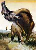 Самыми крупными зверями в конце палеогена были титанотерии, или бронтотерии («громовые звери»). Большинство из них были размером с носорога или слона, тяжелыми животными, внешне очень похожими на носорогов. Относились они к отряду непарнопалых, однако более близкие их родственники не носороги, а лошади. Как и в других группах, самые ранние эоценовые бронтотерии были маленькими, размером с собаку, но потом стали быстро увеличиваться. На их голове, лобных и носовых костях появились роговидные выросты. У некоторых животных эти выросты походили на рога. Возможно, они использовались самцами как турнирное оружие. У азиатских ти-танотериев эмболотериев, изображенных на открытке, на конце морды вверх торчал большой лопатообразный вырост. Высоко расположенные ноздри позволяли эмболотерию дышать, когда он погружал голову в воду в поисках водных растений. Судя по строению небольших зубов, животные питались мягкой пищей. Ранние титанотерии жили во влажных лесах и объедали листву кустарников, поздние обитали по берегам водоемов и питались водными и болотными растениями, которые из-за своих больших размеров они поглощади в огромных количествах. Эмболотерий жил в начале олигоцена, около 37 миллионов лет назад, в Восточной Азии, на территории нынешних Монголии и Китая.