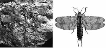 На рисунке изображены отпечаток и реконструкция палеодиктиоптеры — вымершего животного, обитавшего около 310 млн лет назад.