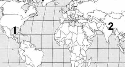 Поставьте точки на карте по приведённым ниже координатам. Обозначьте эти точки соответственно цифрами 1  и 2.