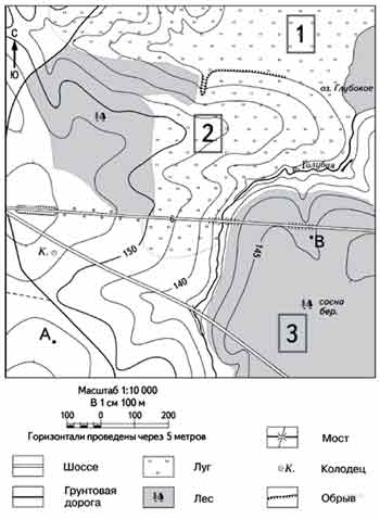 1. На правом берегу (чтобы верно определить берег, обращаем внимание на направление течения реки). 2. В юго-западном (Ю-З) направлении или в направлении на юго-запад (при ответе на данный вопрос, обращаем внимание на стрелку-указатель сторон горизонта).