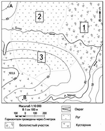 Каким притоком реки Черной (левым или правым) является река Тихая? В каком направлении от реки Черной расположен овраг? Определите расстояние между точками А и В по прямой. Для выполнения этого задания воспользуйтесь линейкой. Расстояние измеряйте по центрам точек.