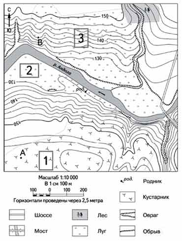 На каком берегу реки Андога, расположен родник? В каком направлении от кустарника на участке 1 находится деревянный мост?  Определите расстояние между точками А и В по прямой. Для выполнения этого задания воспользуйтесь линейкой. Расстояние измеряйте по центрам точек.