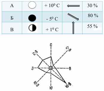 Из условия следует, что это рисунок Б. Погода в этот день была пасмурная погода, дул северо-западный ветер, температура воздуха была -50 С, относительная влажность воздуха составляла 80 %