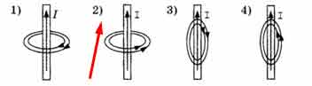 По прямолинейному проводнику идёт ток в направлении, указанном стрелкой. Магнитные линии проводника с током правильно показаны на рисунке