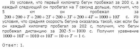 Бегун, стартовавший на дистанцию 5 км, первый километр пробежал за время Т0= 200  с. Каждый следующий километр он пробегал на T секунд дольше. Определите T, если известно, что средняя скорость бегуна оказалась такой, как если бы он каждый километр пробегал за 202 с.