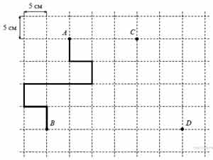 Лист бумаги расчерчен на квадраты со стороной 5 см. От точки А к точке В проведена ломаная по сторонам квадратов.